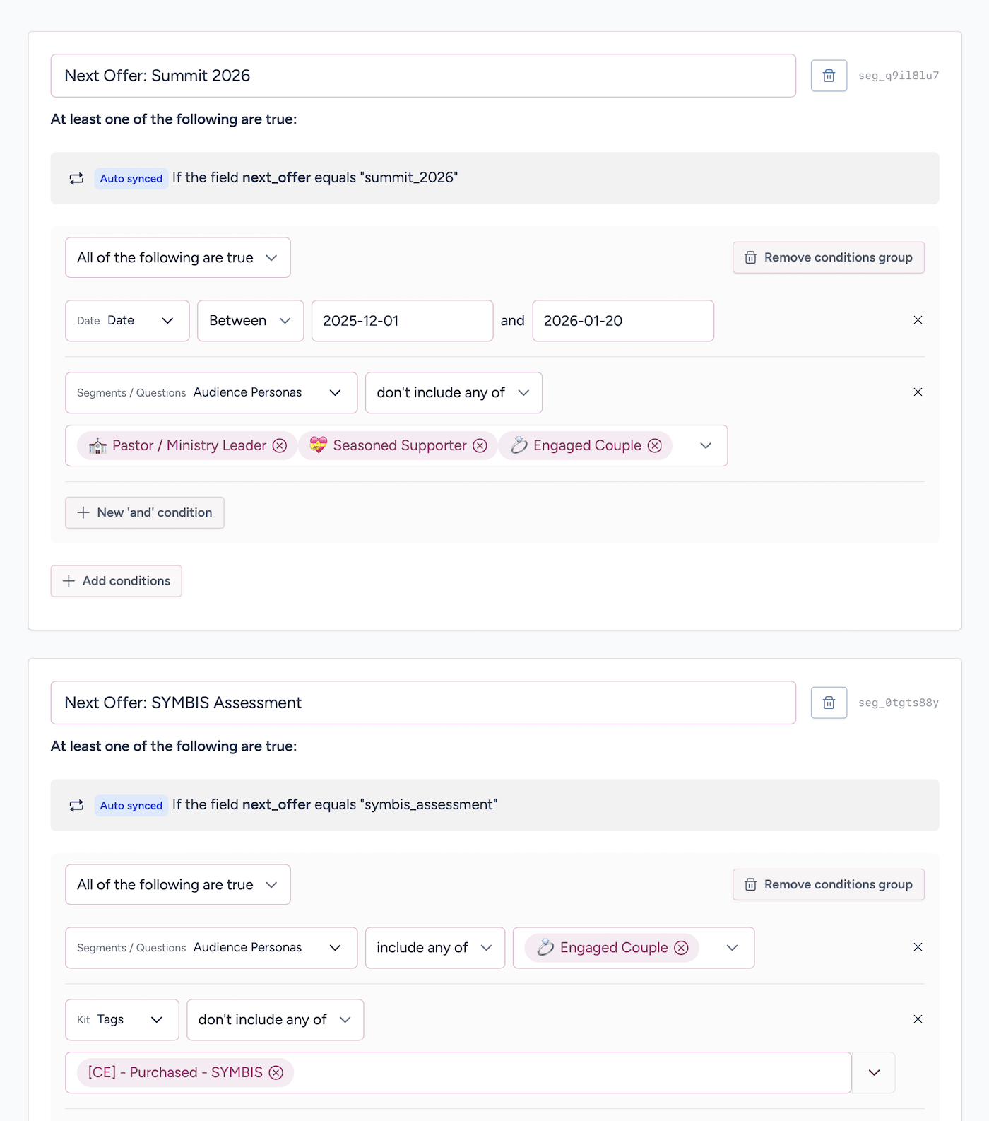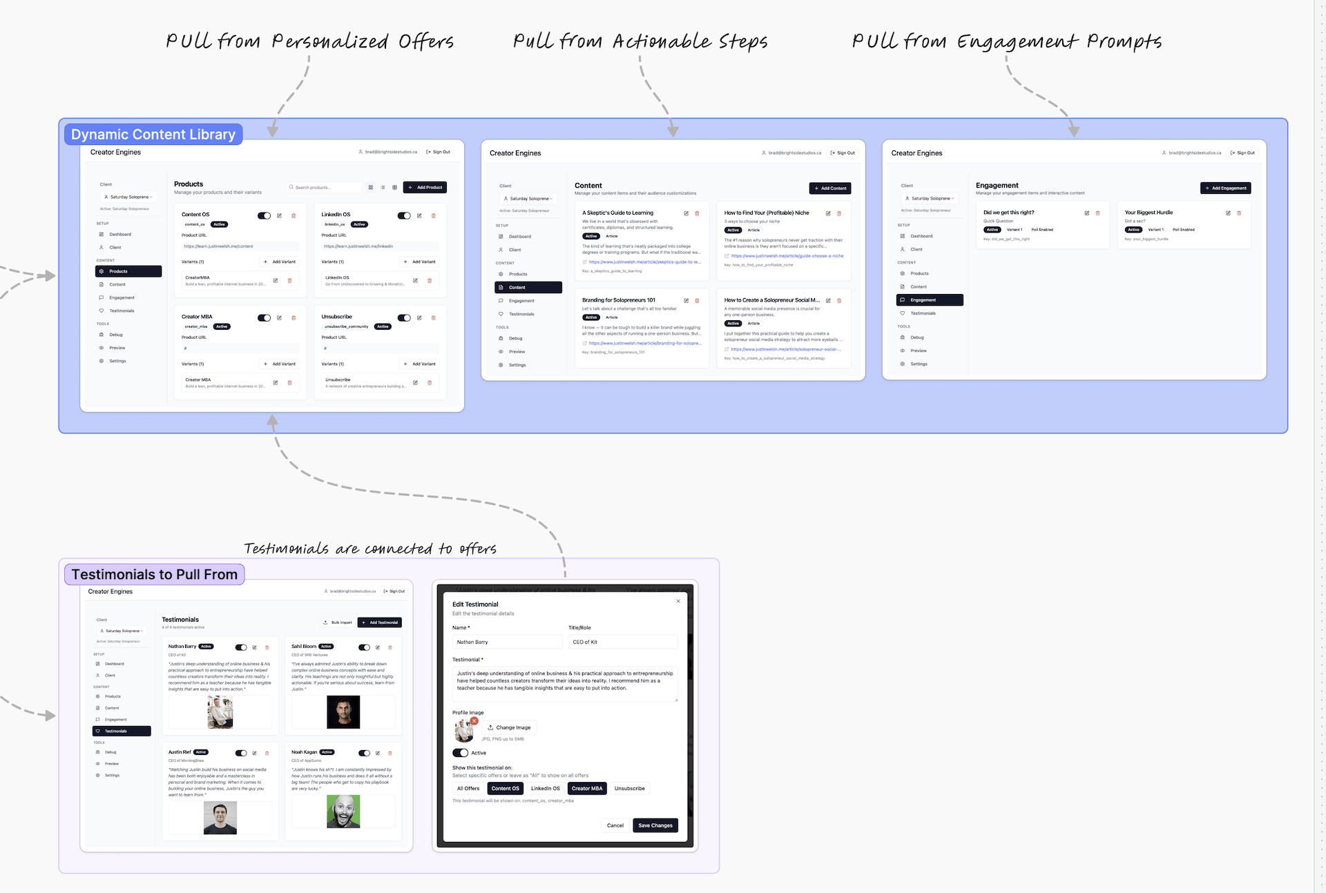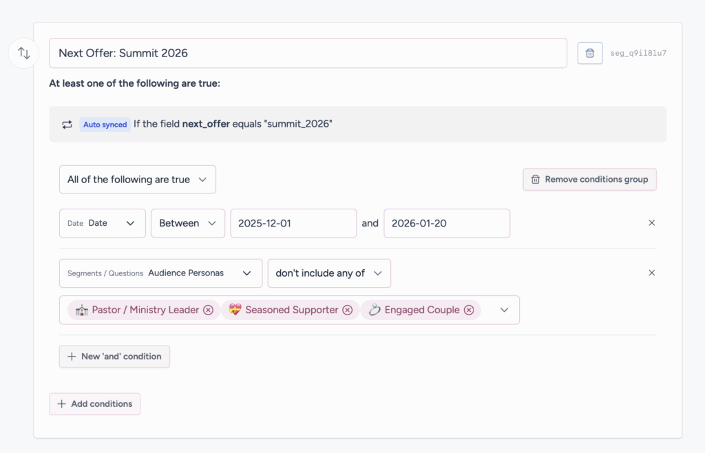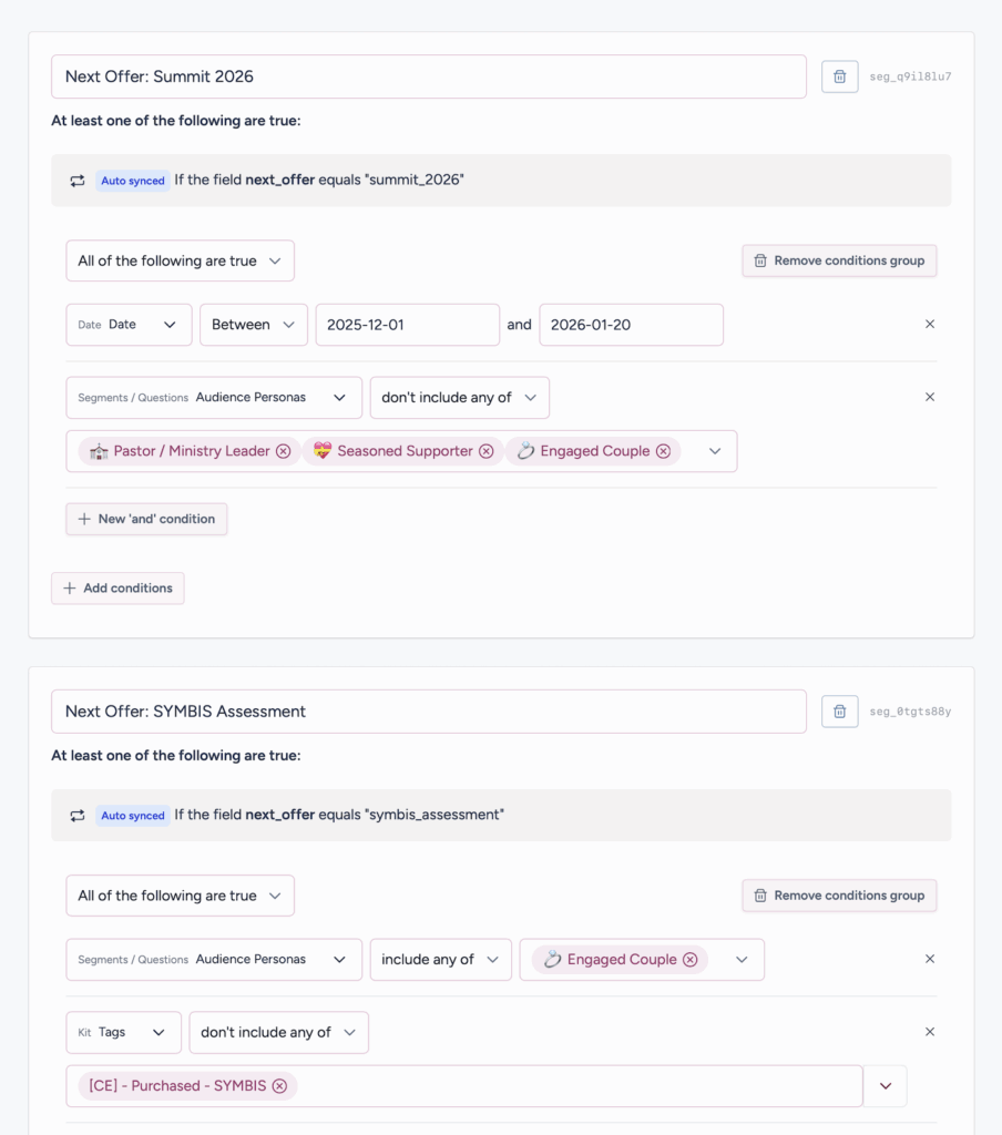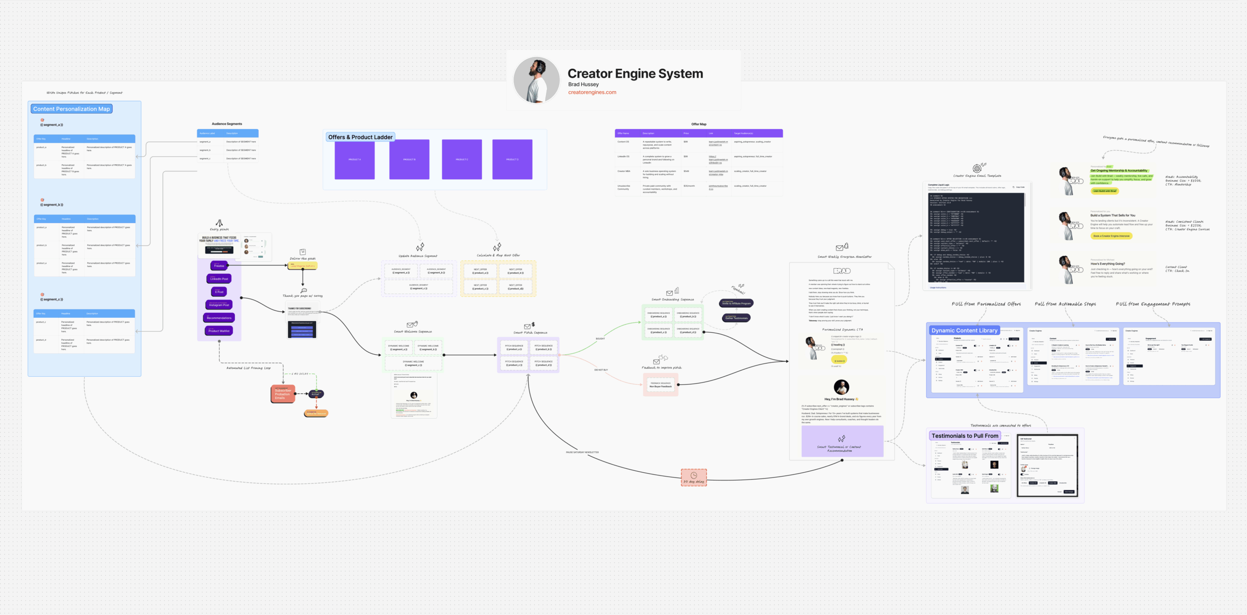 If you ever ascend in your segments, the system knows. Now you’re not a freelancer, you’re full-time and doing $500K a year. Your needs, wants, goals, pain points, audience segment, and offer all get updated.