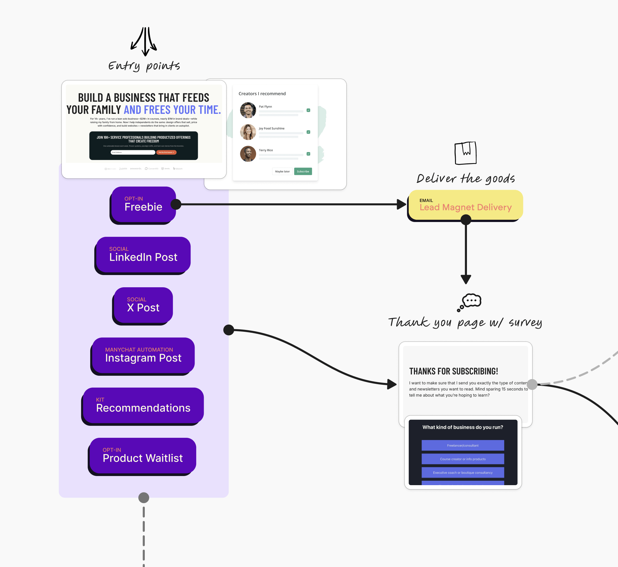 Entry points are how people join your email list. That might be lead magnets, freebies, LinkedIn posts, content, ads, Kit recommendations, or your creator profile.