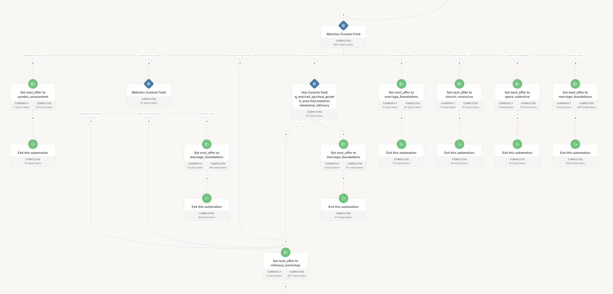 This automation routes people to the right pitch based on their calculated next offer and their lead score, so they get the most relevant product at the right time.