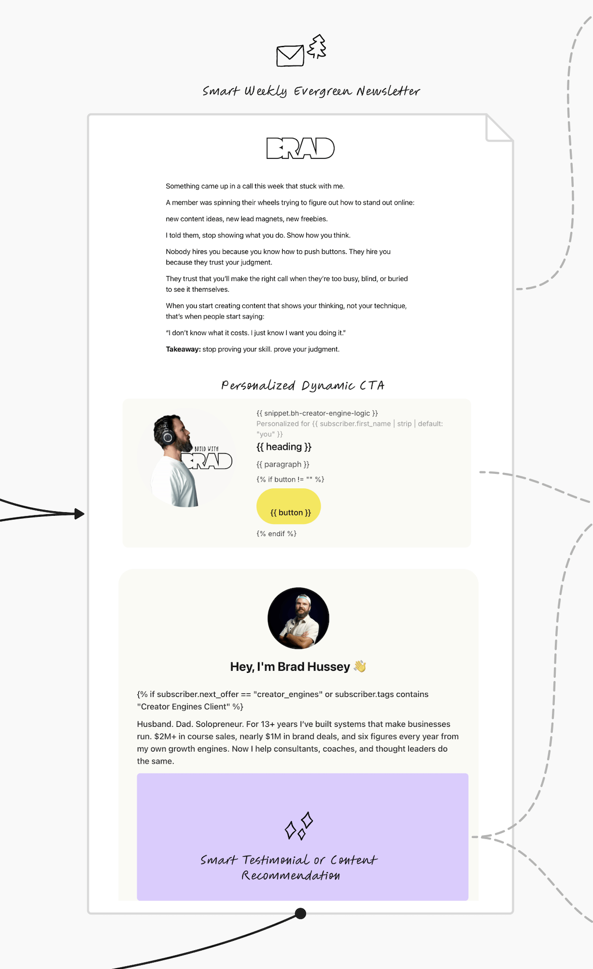 This is the ongoing weekly newsletter that sends automatically with personalized CTAs, testimonials, and offers based on who’s reading.