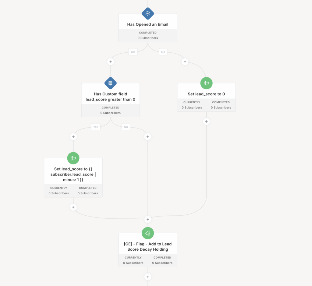 Lead score decay works like this: if they’ve opened an email in the last 60 days and their lead score is greater than zero, we minus their lead score custom field by one.