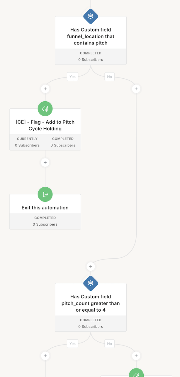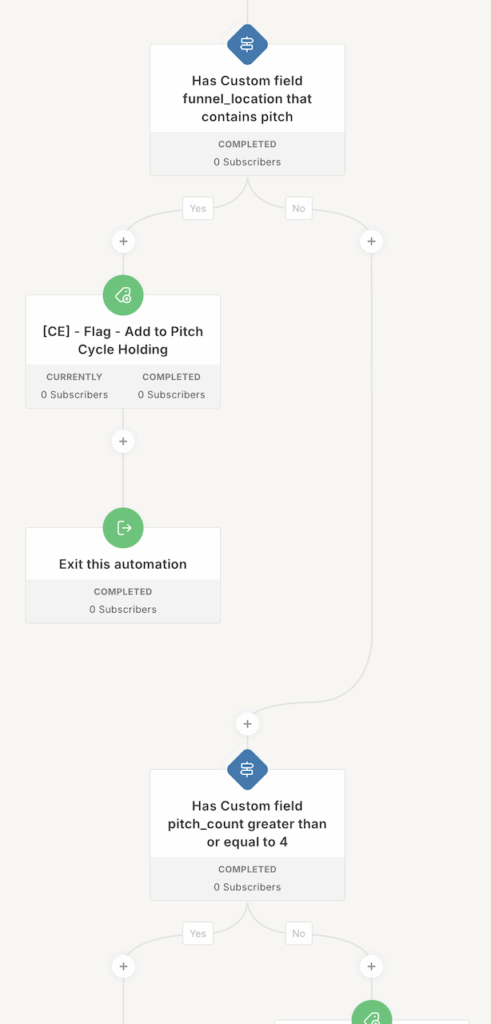 First, the system checks if the funnel location contains the word “pitch.” If it does, we add them back to the pitch cycle holding and go back to the top so we don’t pitch them. Nobody wants to be pitched while they’re already in a pitch.